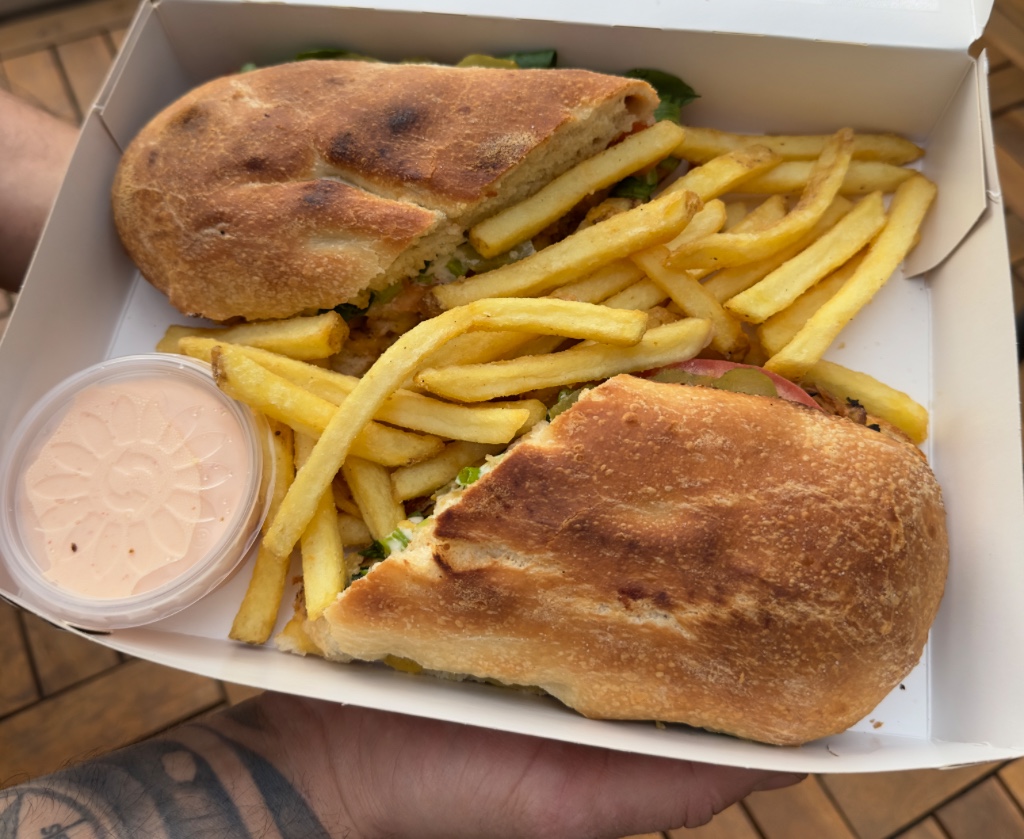 Bułka naszego wypieku, a w niej szarpana wieprzowina, pomidor, ogórek, mix sałat, sosy. Do zestawu dołączamy frytki oraz sos sriracha.