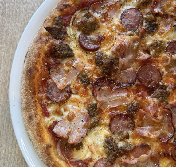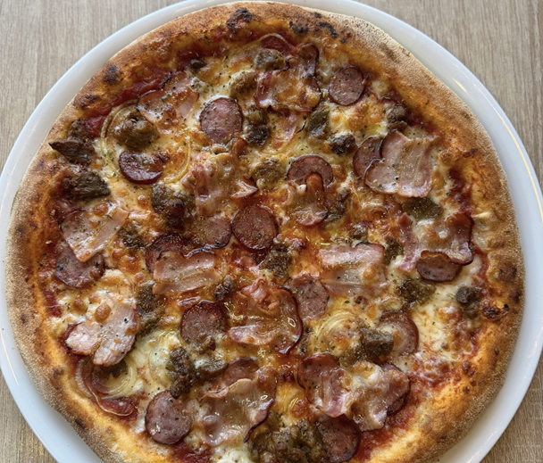 sos, podwójny ser mozzarella, salami, mięso kebab, boczek, cebula, pieczarki